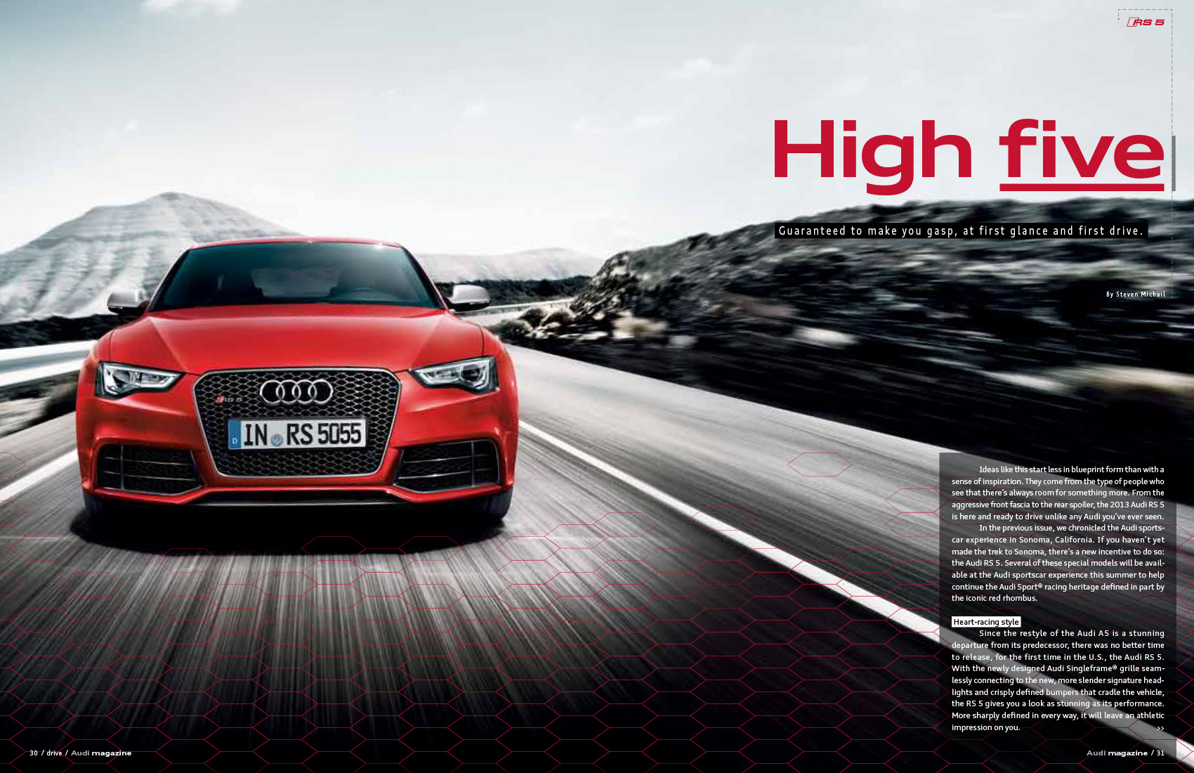 The release of the Audi RS5 was no small release to the US market. Taking their already powerful S line of vehicles to the next level. This article printed in Audi Magazine and was also published in the Audi library for iPad and Android powered devices.